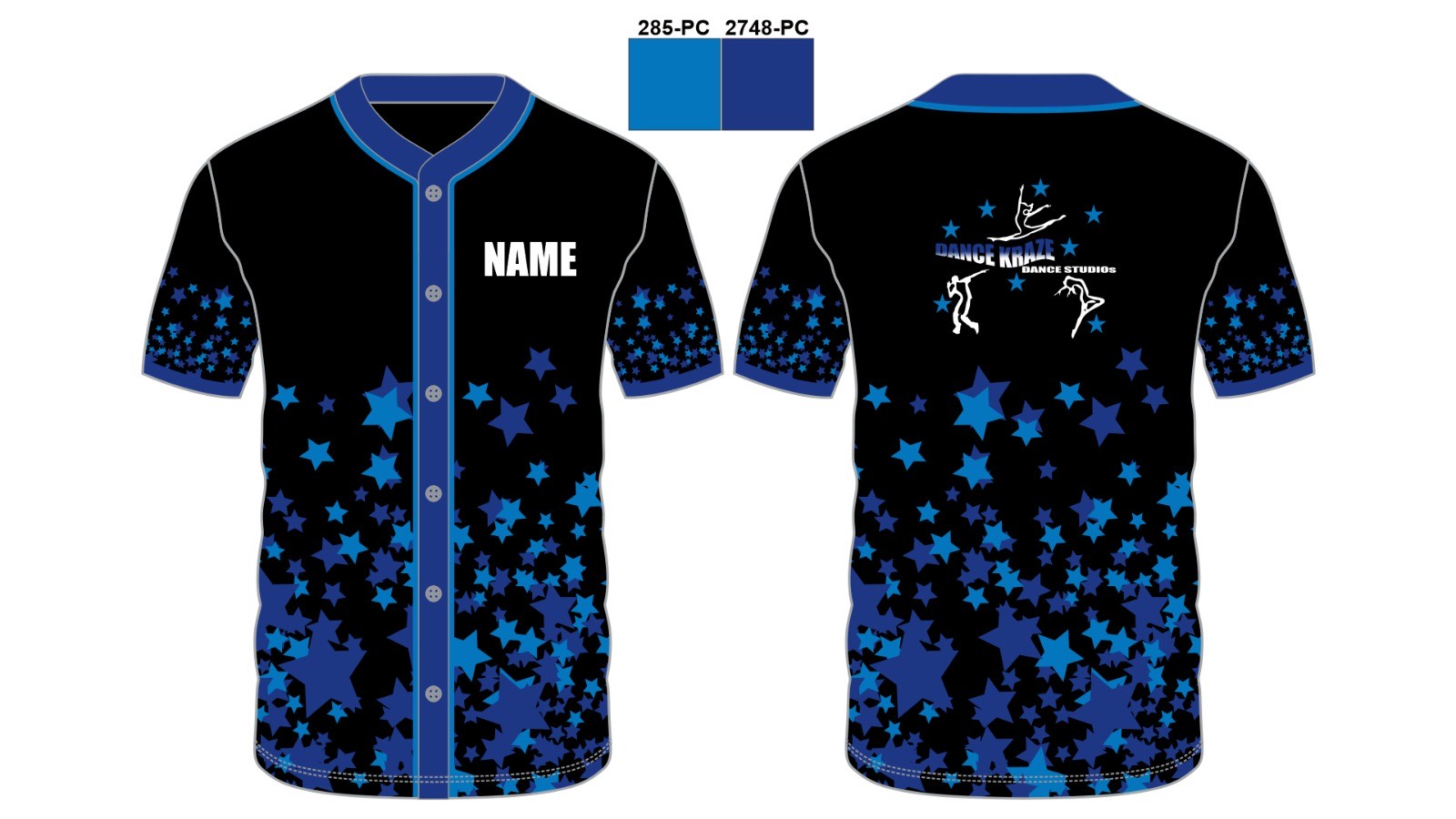 Show your team spirit in our jersey! Featuring full button up front and custom printed names! Super soft, support your dancer at competitions, wear to class, as a coverup over costumes, or to show your team spirit everyday. All items will ship to your studio for distribution there.